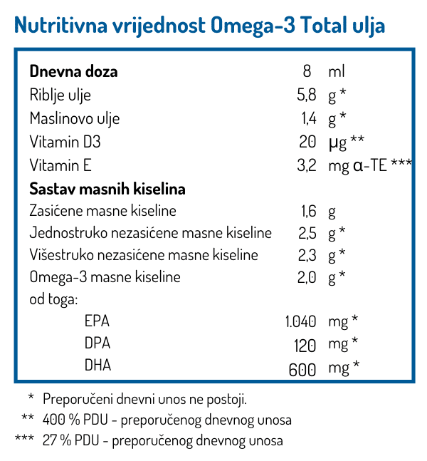 Omega-3 Total ulje (200 ml) sadrži jedinstvenu kombinaciju prirodnog ribljeg ulja, bogatog EPA, i hladno prešanog maslinovog ulja iz organske proizvodnje (antioksidans). Preporučena dnevna doza (8 ml odnosno 1 žlica) sadrži 2.000 mg Omega-3 masnih kiselina EPA i DHA.